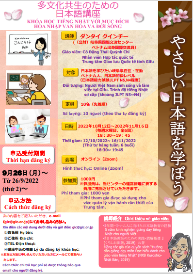 2021年の在留外国人の統計によると、岐阜県の在留ベトナム人は9,981名とフィリピン、ブラジルの次になっています。岐阜県内の在住ベトナム人が、岐阜県で安全かつ安心に暮らせるために「多文化共生のための日本語講座」を開催します。ベトナム出身講師と母語や日本語で交流して日本語学習の意欲を高め、日本文化の理解も深めていただければ幸いです。