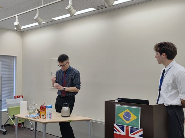 今回のイベントは、ブラジル出身の国際交流員ソラト・グスタボさんとイギリス出身の国際交流員パーカー・ラファエルさんが講師を務め、計13名の参加者が両国のコーヒーと紅茶の文化を体験する時間となりました。