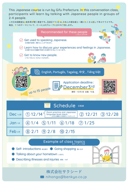 ※ Priority will be given to those who live in areas without Japanese language classes or who are not currently attending one.