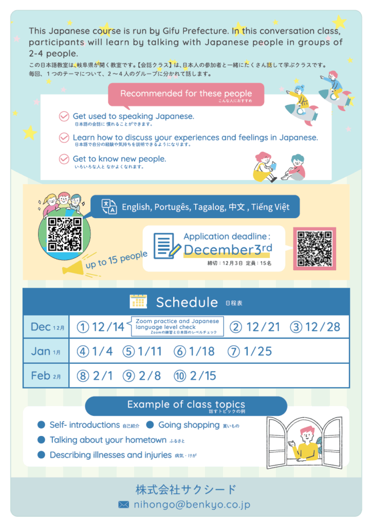 This Japanese course is run by Gifu Prefecture. In this conversation class, participants will learn by talking with Japanese people in groups of 2–4 people.