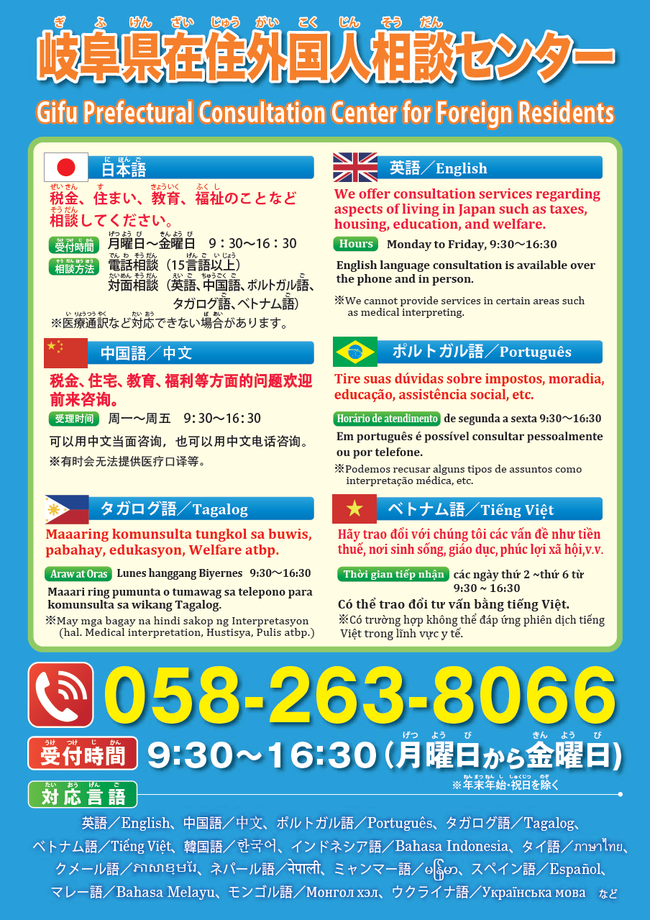 Ang GIC ay nag bukas ng isang Gifu Foreign Resident Consultation Center upang ang mga dayuhang residente ay maaaring kumonsulta sa iba't ibang wika tungkol sa mga problema sa buhay (buwis, pabahay, edukasyon, kapakanan, at iba pa).Maaari namin kayong tulungan sa higit na 15 wika. Pangangalagaan ang inyong mga kompidensyal o pribadong impormasyon kaya't mangyaring sumangguni o komunsulta ng may pagtitiwala.